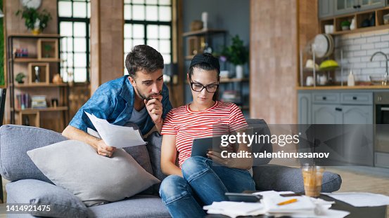 Couple calculating bills at home using laptop and calculator. Young couple working on computer while calculating finances sitting on couch. Young man with wife at home analyzing their finance with documents.